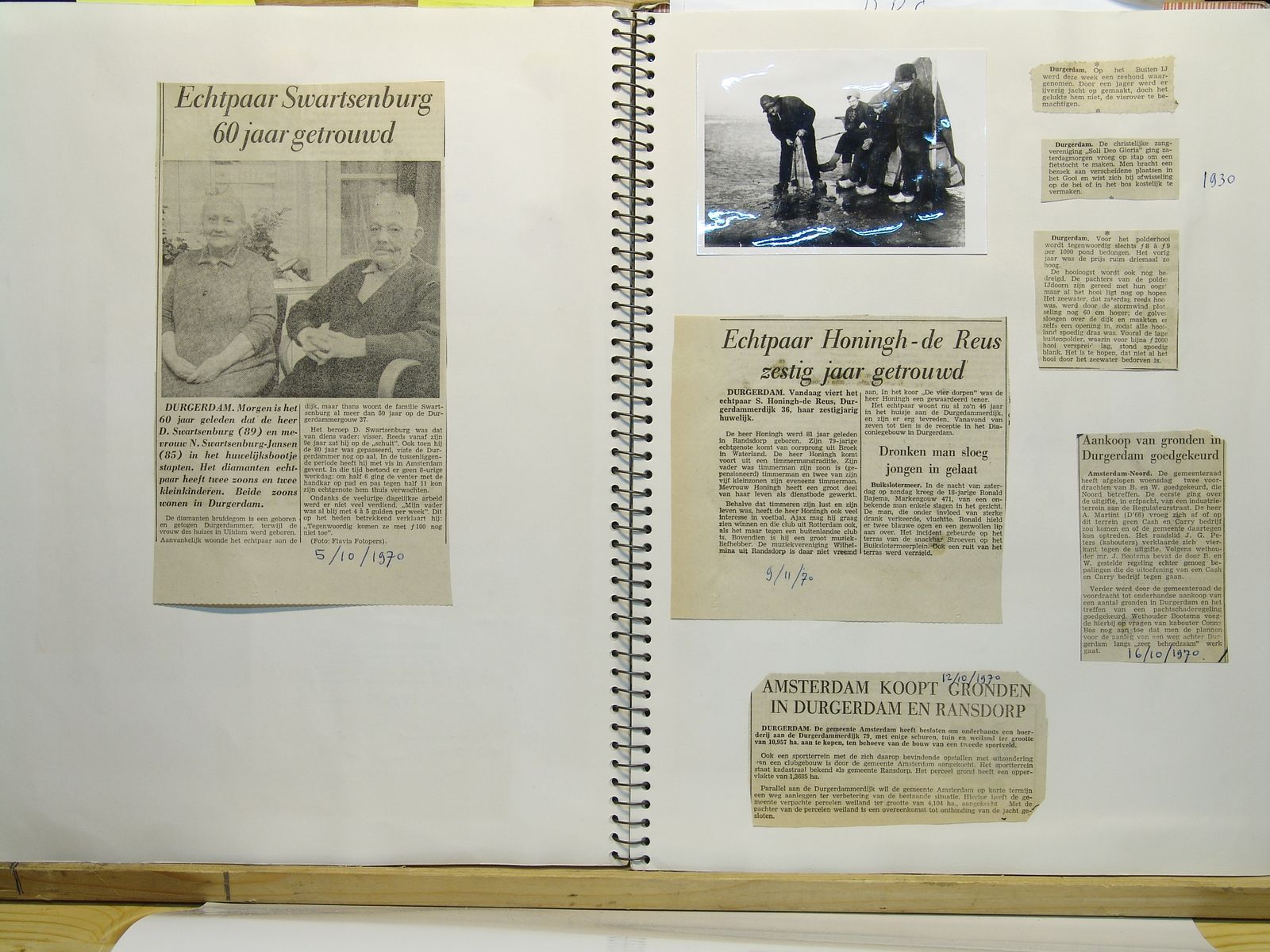 Links, echtpaar Swartsenburg. Rechts, Echtpaar Honingh-de Reus; Amsterdam koopt grond in Durgerdam en Ransdorp; zeehond in buiten IJ; zangver. Soli Deo Gloria; prijs van hooi gezakt