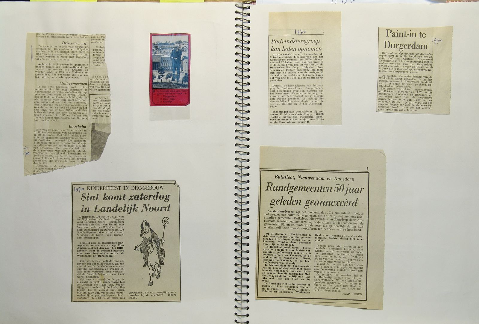 Links, Durgerdam en Holysloot zelfstandig in 1815. Rechts, padvinders in Durgerdam; paint-in Durgerdam; Buiksloot, Nieuwendam en Ransdorp in 1920 geannexeerd door Amsterdam