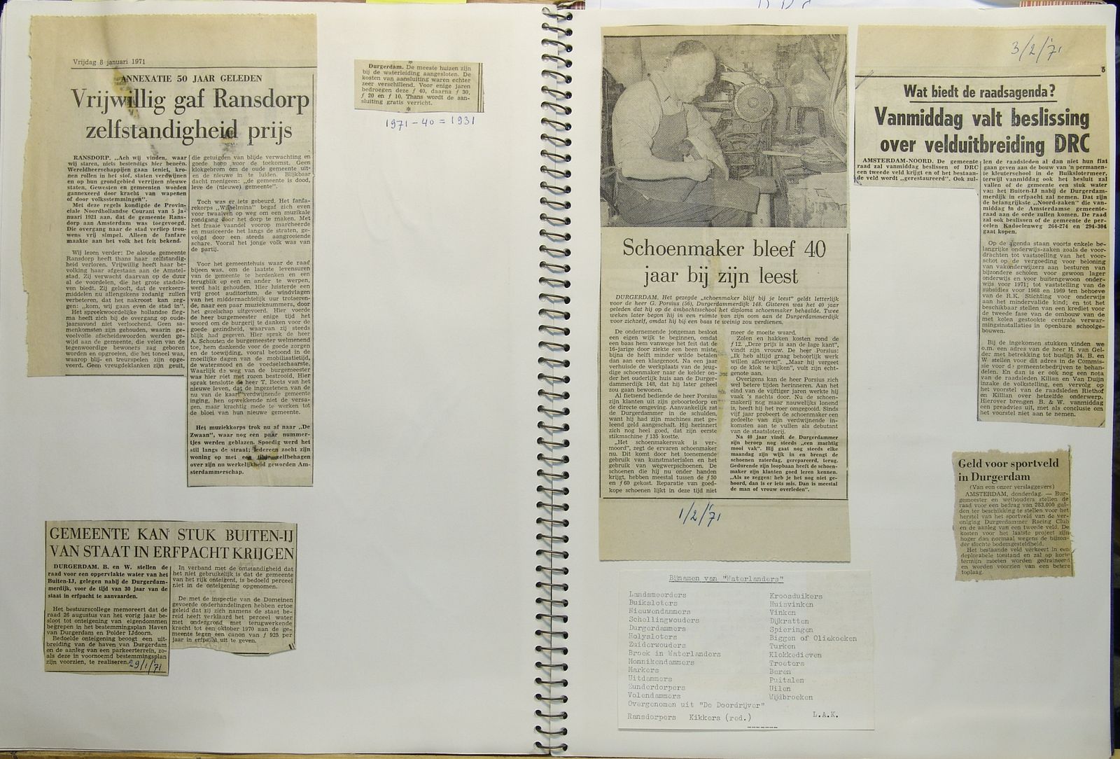 Links, annexatie Ransdorp 5.1.1921. Durgerdammers aangesloten op waterleiding. Rechts, schoenmaker G. Porsius; DRC